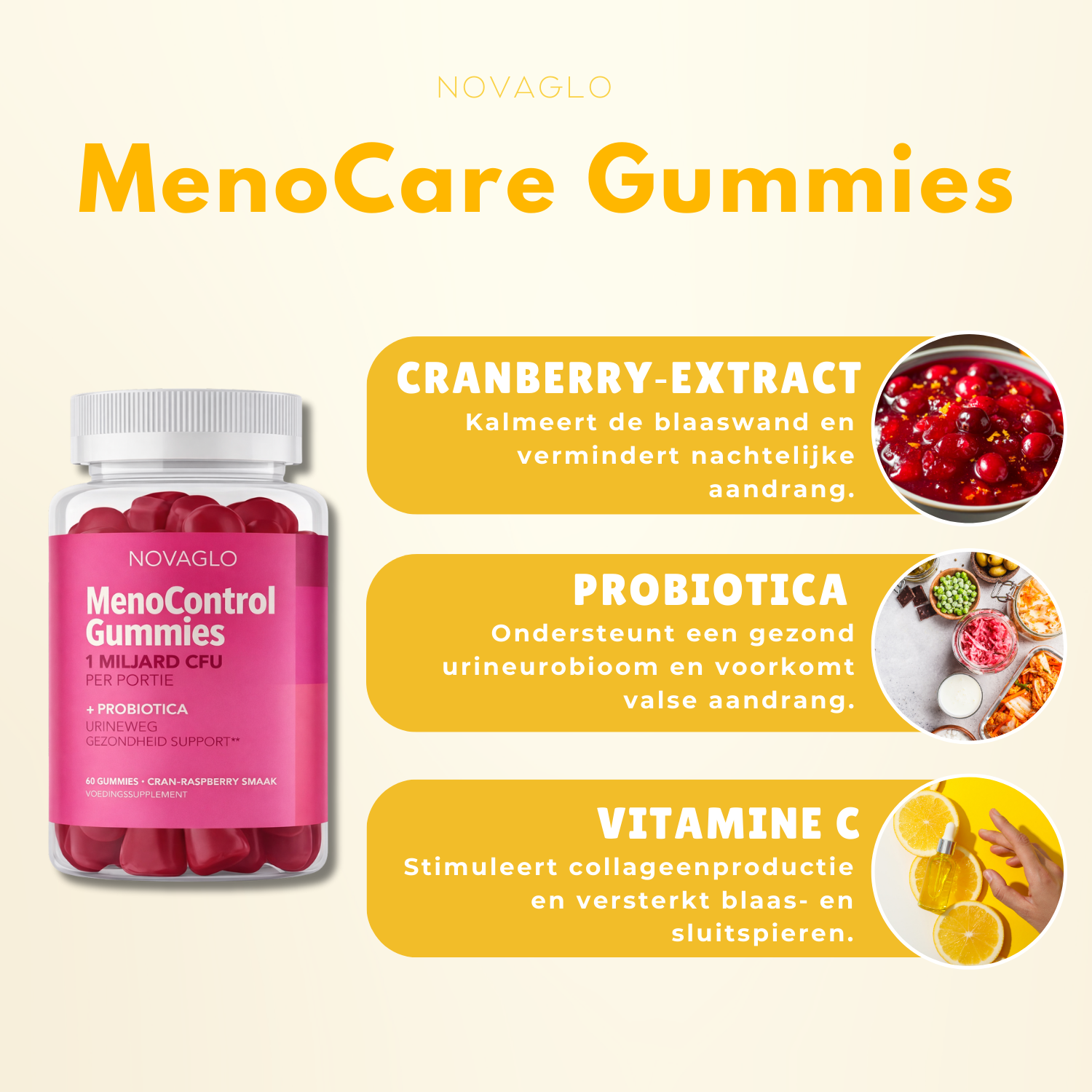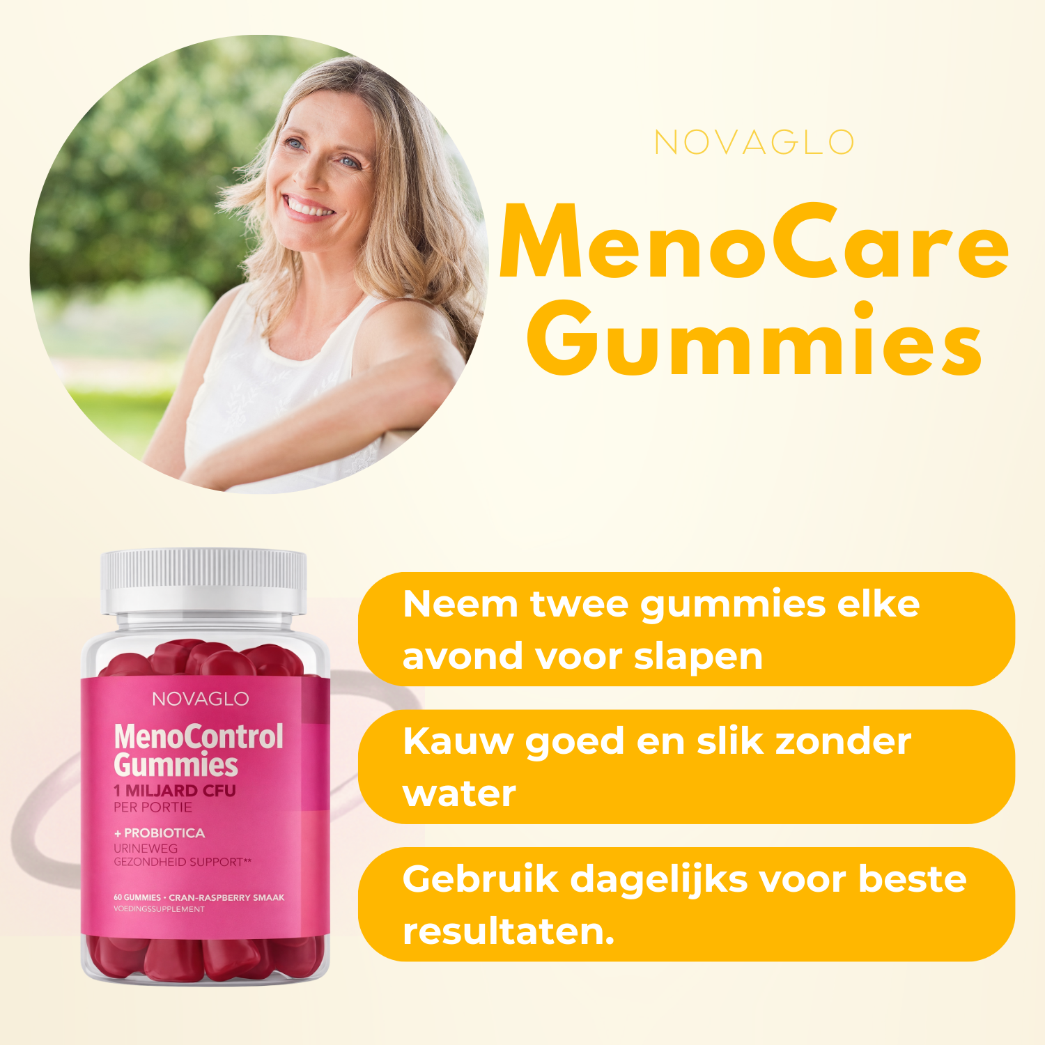 Probeer Novaglo MenoControl Gummies vandaag nog, zonder risico, en profiteer van onze 1+1 GRATIS actie!