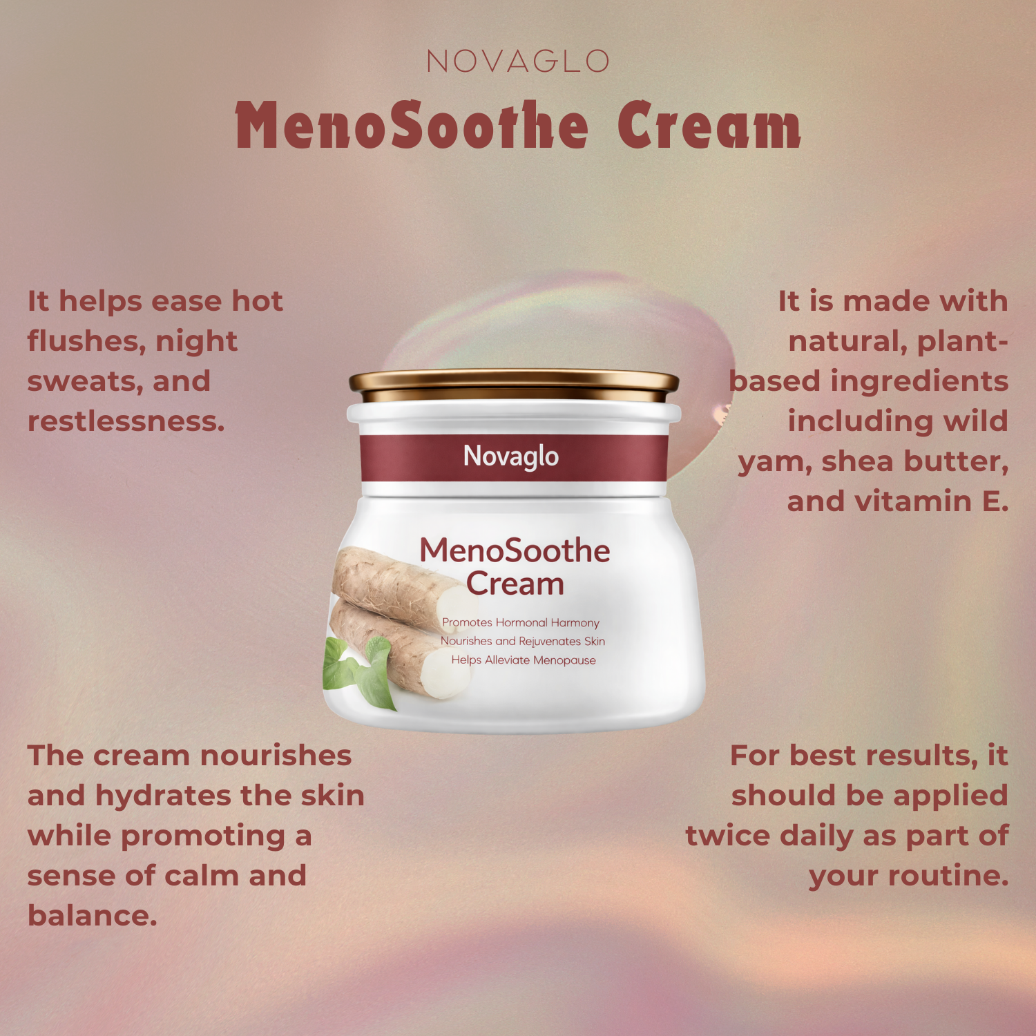 When applied to the skin, Novaglo MenoSoothe Cream delivers nourishing, plant-based ingredients that work with the body’s natural processes. This topical support helps promote relaxation, skin comfort, and a sense of balance.