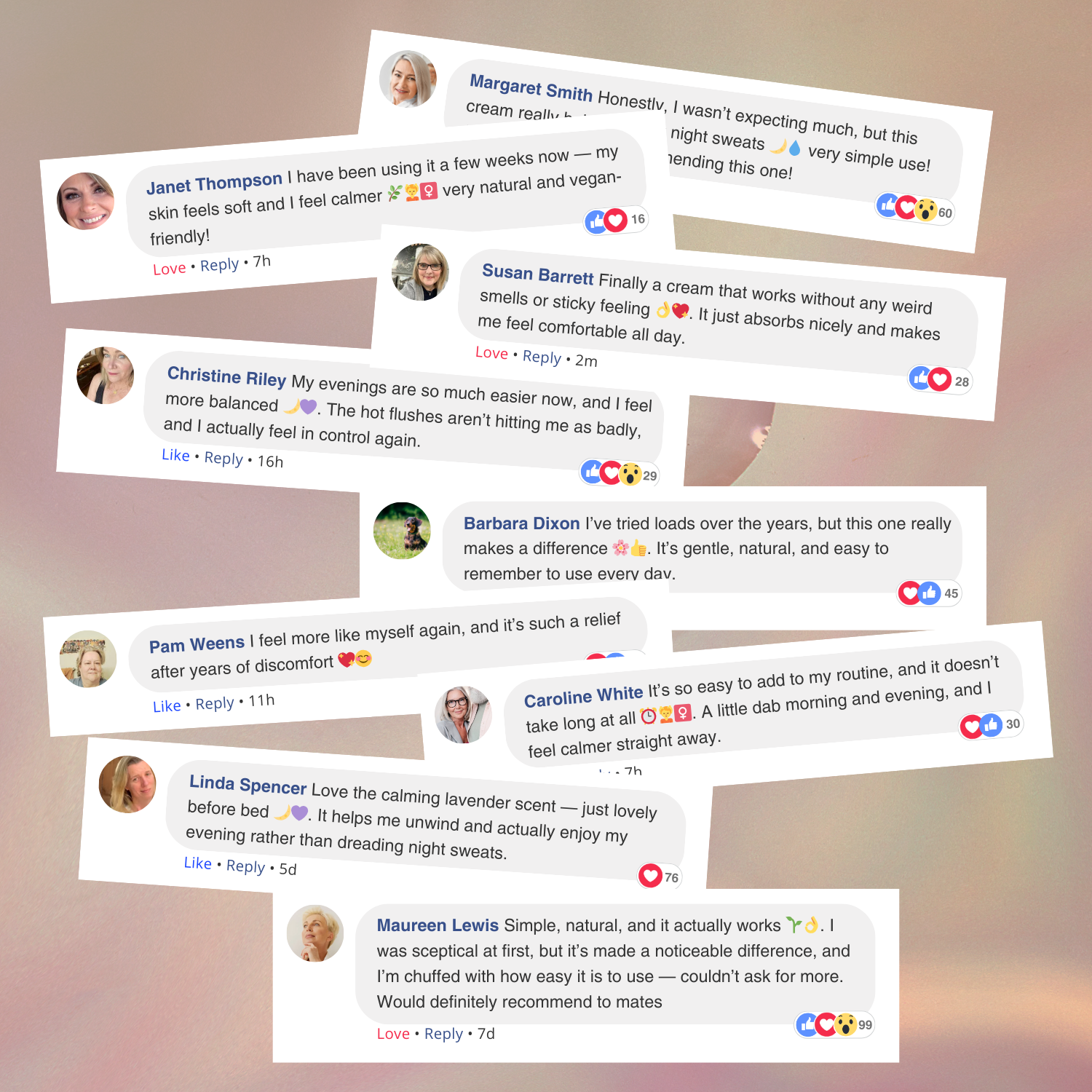 Research suggests that the carefully selected plant-based ingredients in Novaglo MenoSoothe Cream help support the body during menopause, easing common discomforts such as hot flushes, night sweats, and restlessness.