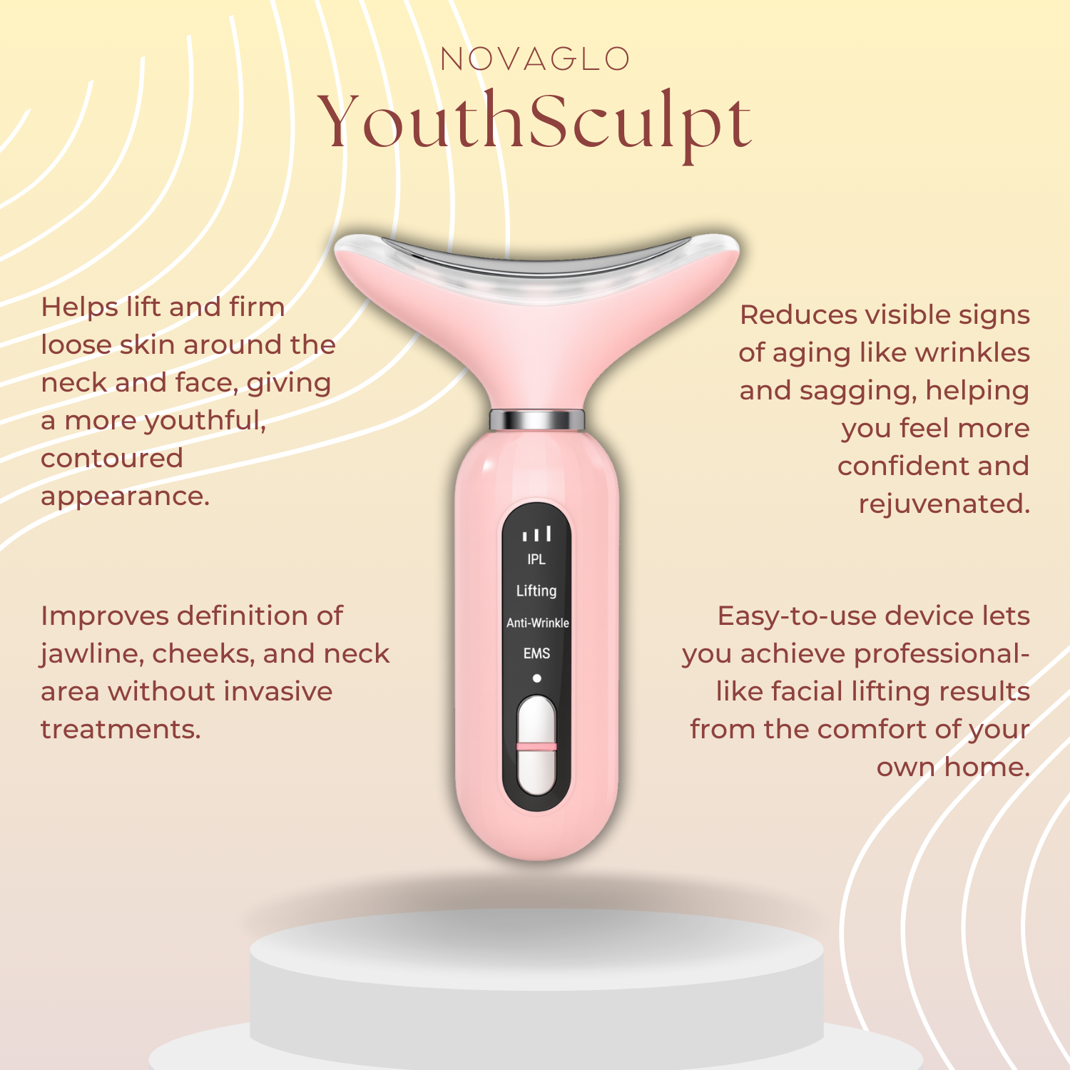 The Novaglo YouthSculpt is designed to support facial massage at home using gentle vibration, helping to stimulate the skin and facial muscles as part of a simple self-care routine.